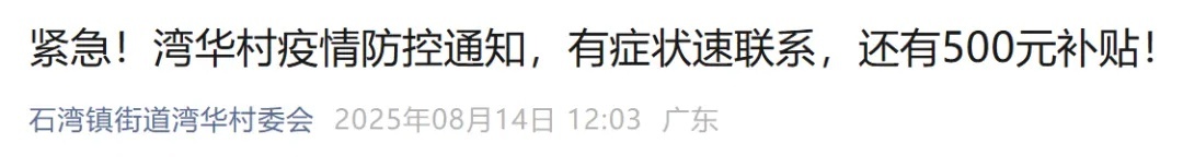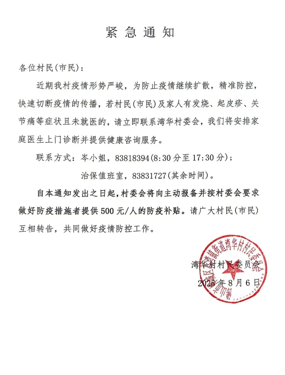 8月14日,佛山禅城区石湾镇街道湾华村委会发布“紧急通知”称,近期该村疫情形势严峻,为防止疫情继续扩散,精准防控,快速切断疫情的传播,若村民(市民)及家人有发烧、起皮疹、关节痛等症状且未就医的,请立即联系湾华村委会,将安排家庭医生上门诊断并提供健康咨询服务。